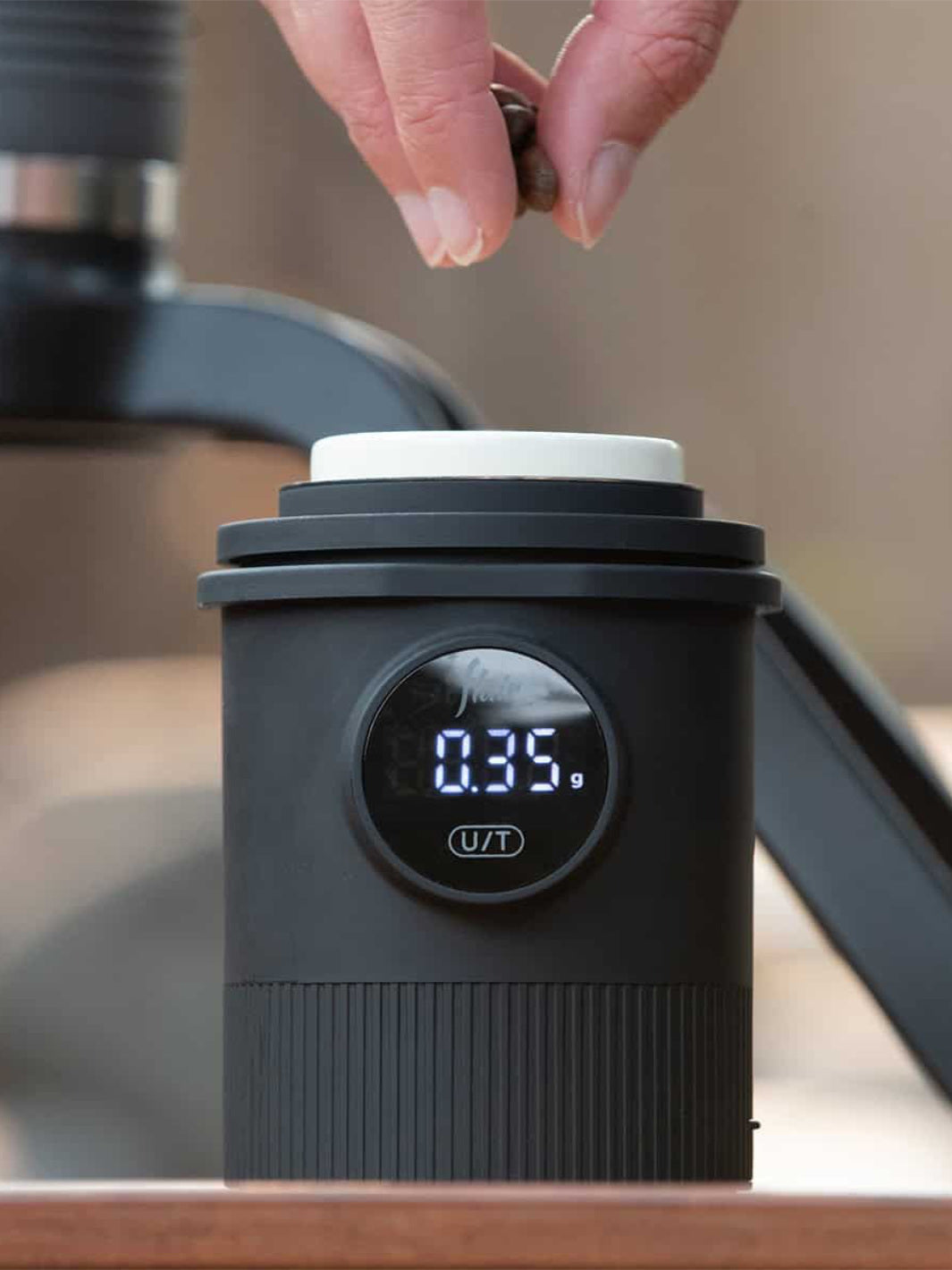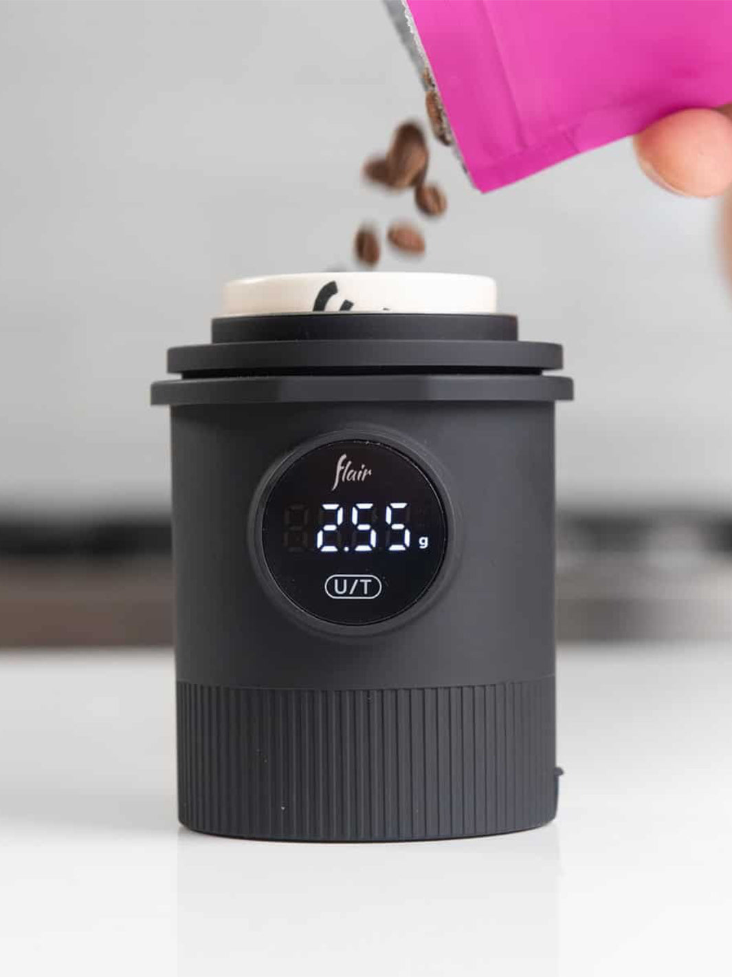 Simplify your coffee setup with the Flair Weigh Cup, a digital coffee dosing cup that weighs your beans and espresso shots while eliminating the need for a scale.