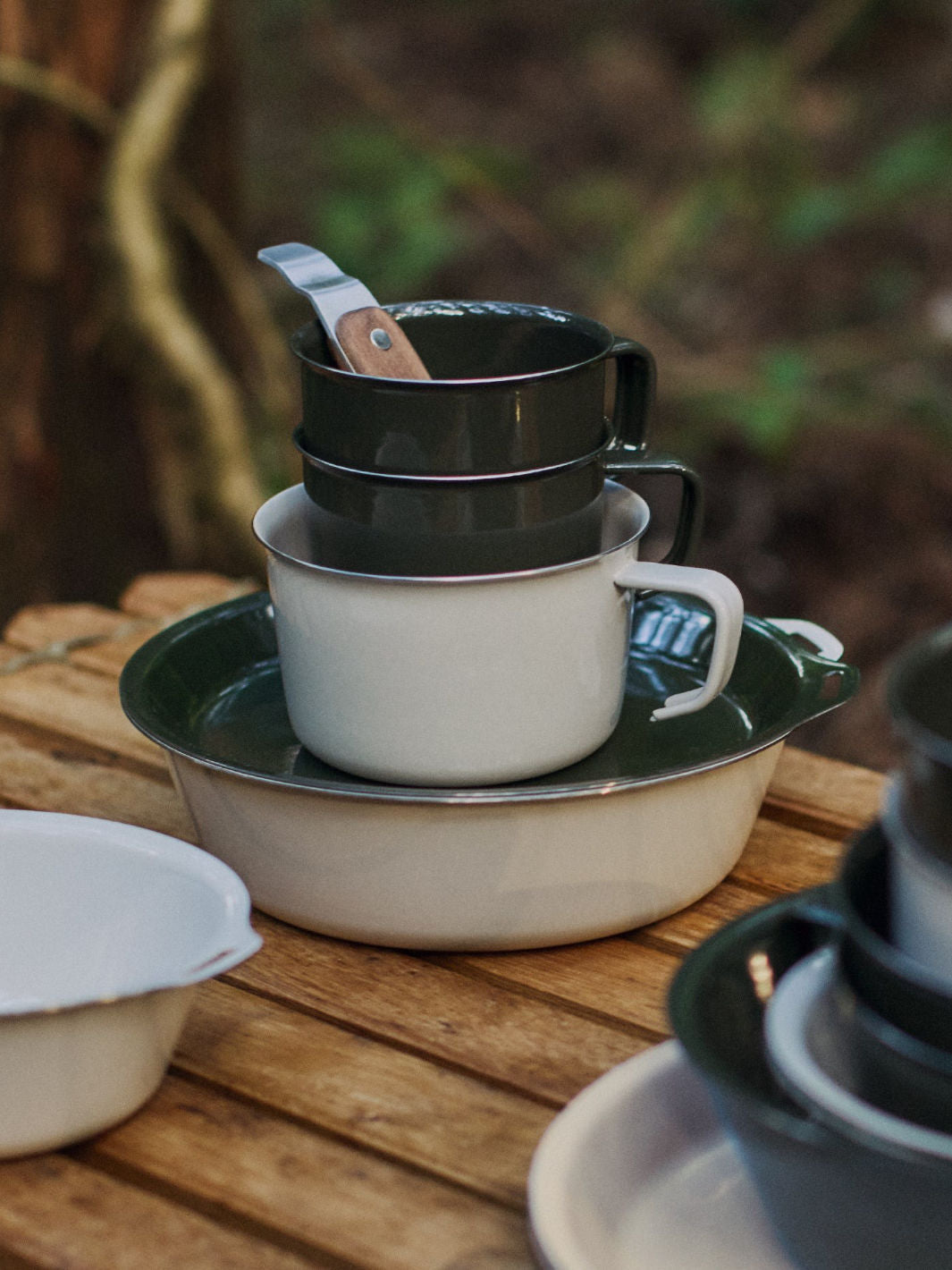 FORIS enamelware is heat-resistant, wear-resistant, odourless, and easy to clean. The stainless steel base material makes it durable yet thin and light, while the plates and bowls of the same size fit together perfectly, preventing dust and ash from getting in when outdoors and allowing them to be used as storage containers.