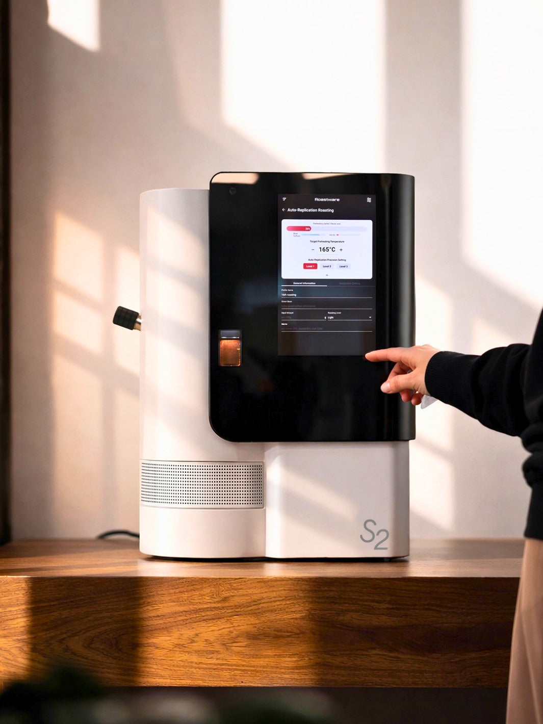 Alongside automated guidance, the S2 offers all the precision and control required for professional roasteries, specialty cafés, and competitors to develop and refine flavour profiles — including 100 levels of heat adjustment.